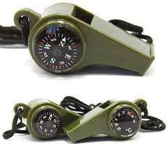 - Sifflet en plastique durable et corde nylon – D’un côté il y a une boussole, et de l’autre se trouve un thermomètre.